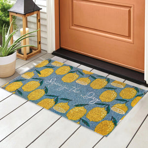 Leaving in the mornings with a bright message to ''Squeeze The Day!'' Each mat is designed with colorfast fibers on a slip resistant rubber backing. This makes it easy to knock debris off your shoes when coming in and preventing a fall when the ground is wet. These mats are easy to clean as you simply shake the dirt out. Fibers will come loose as you begin to use the mat which is perfectly normal.