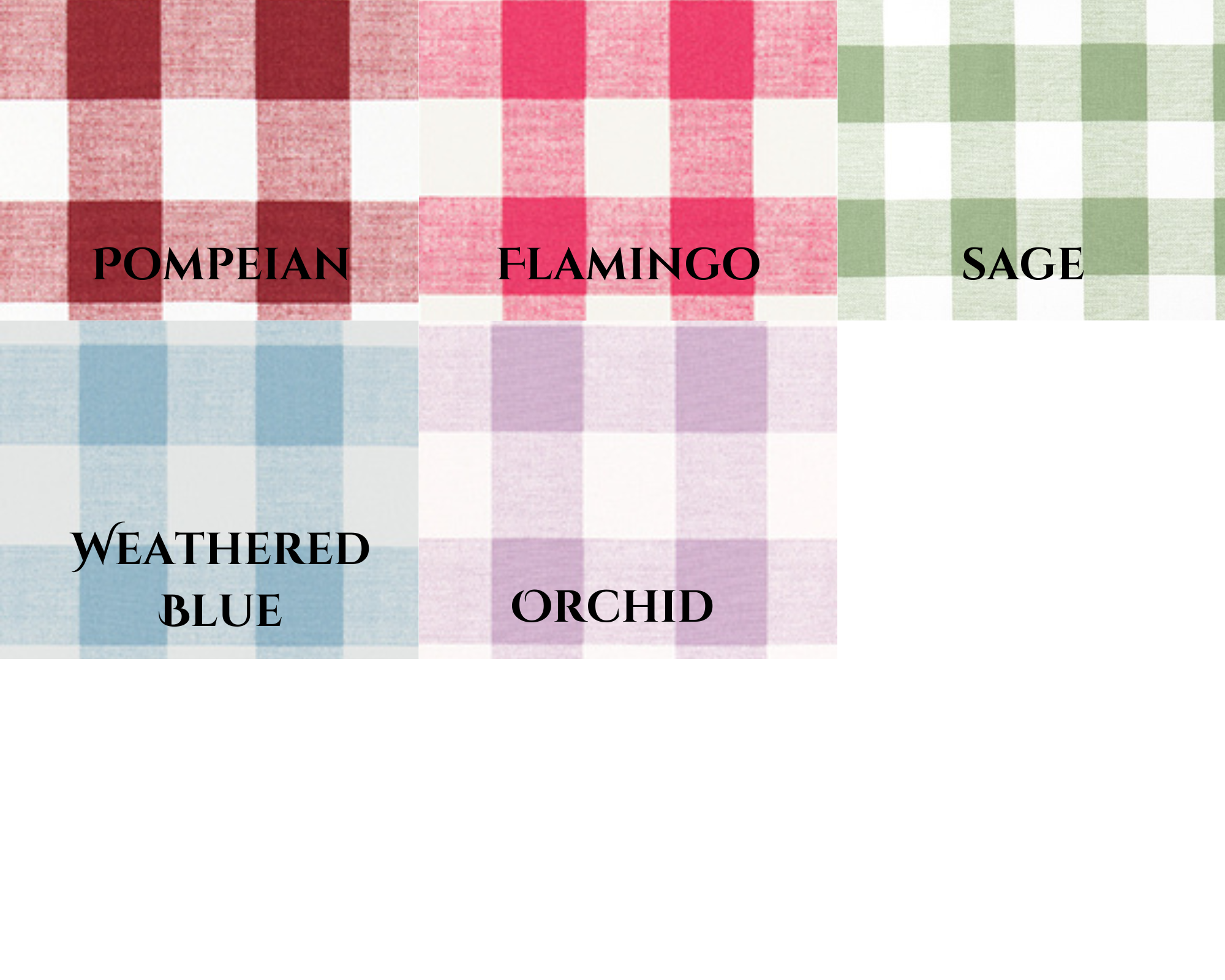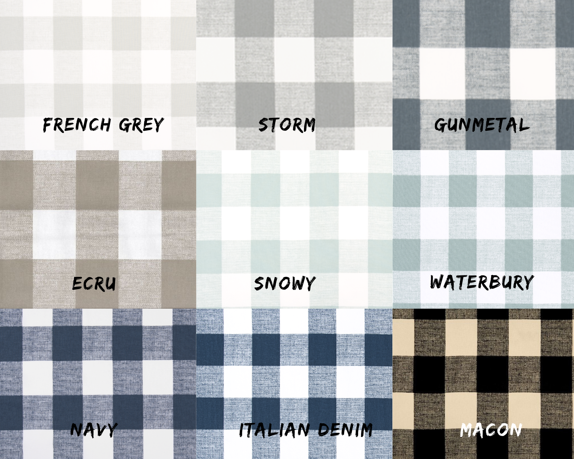 Ecru, Cloud Linen, French Grey, Storm, Gunmetal, Black White, Macon Black, Black Linen, Snowy, Waterbury, Sage, Cashmere Blue, Weathered Blue, Navy, Italian Denim, Navy Linen, Lipstick, Pompeian, Flamingo, Yellow, Monarch, Bella, Blush, Orchid