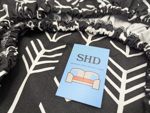 Transform your indoor furniture, RV cushions, benches and more in minutes with the Pre-Made Ready Ship RV U-Shaped Dinette Bundle 8 Piece Elastic Fitted Cushion Covers in black arrows. Made from 100% cotton for maximum comfort and protection, these covers add warmth and style to your home or RV interior.